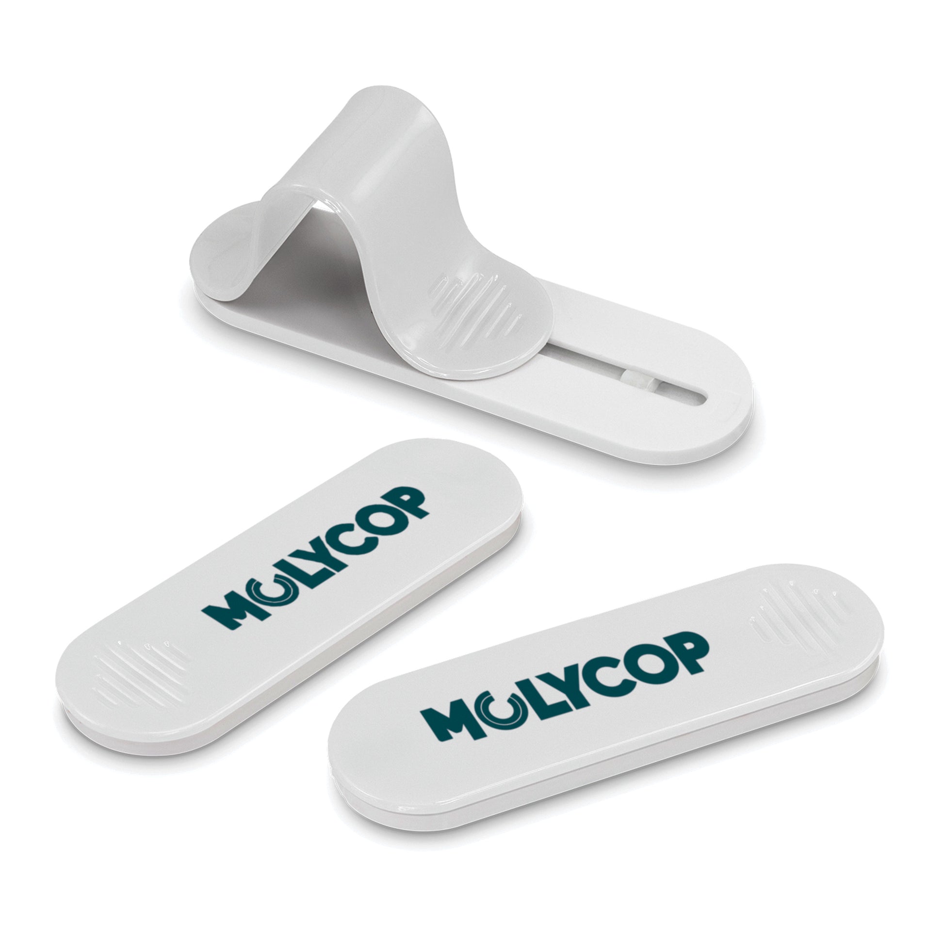 Slim phone grip that adheres securely to the back of a phone or phone case. It has a soft-touch plastic slider that moulds itself into a secure finger grip or a handy phone stand.